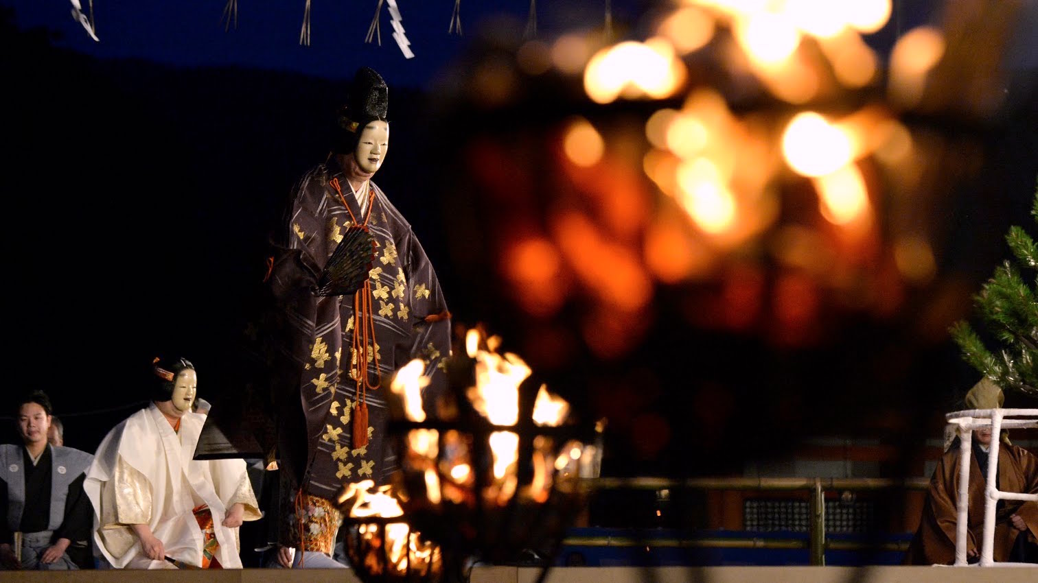 Dans l’enceinte du sanctuaire Heian-jingu à Kyōto, une scène de théâtre est baignée par la lueur des torches. L’atmosphère relève du fantastique, et public retient son souffle avant l’entrée des acteurs, ceux de l’école Kanze, l’une des plus prestigieuses du Japon…