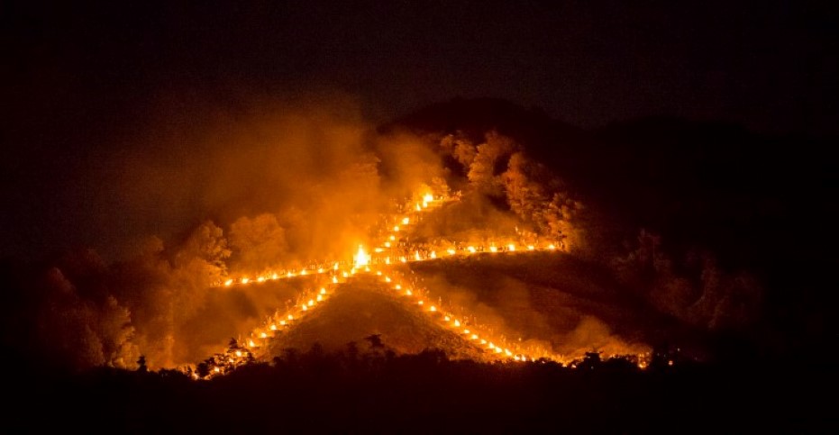 Puis, sur les monts Matsugasaki Nishiyama et Higashiyama, se consument les signes Myô ( 妙 ) et Hô ( 法 ) qui forment les « merveilleux enseignements du Bouddha », tandis que le Mont Mandara-san se pare d’un immense torii incandescent – le portail traditionnel japonais à l’entrée des sanctuaires shintō – reproduit sur son flanc.