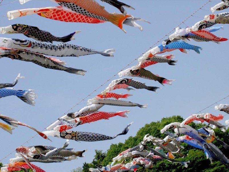 Sur les balcons, dans les jardins, au-dessus des rivières, les symboles de ce jour particulier flottent alors dans la brise de printemps : des carpes multicolores de papier ou de soie, accrochées par les foyers ayant eu au moins un garçon. La carpe, ce poisson qui remonte les rivières à contre-courant en période de ponte, est un symbole de courage et de persévérance, que les parents japonais aimeraient inculquer à leur progéniture masculine.