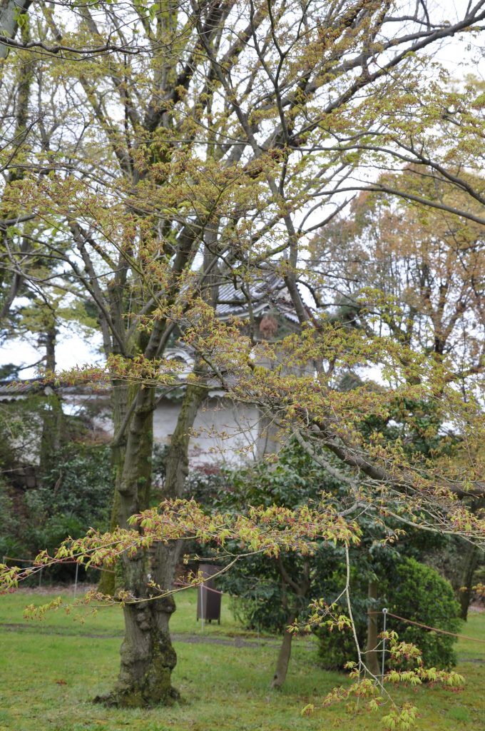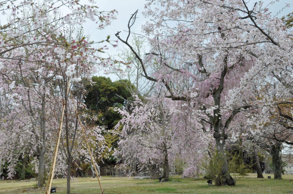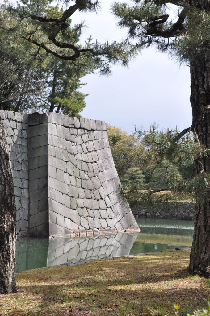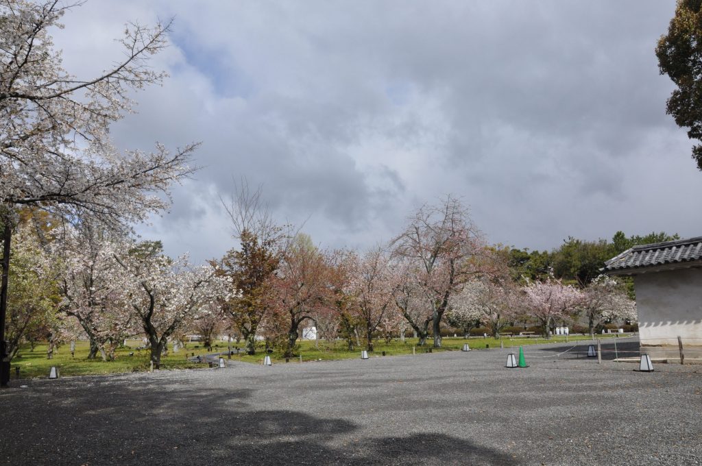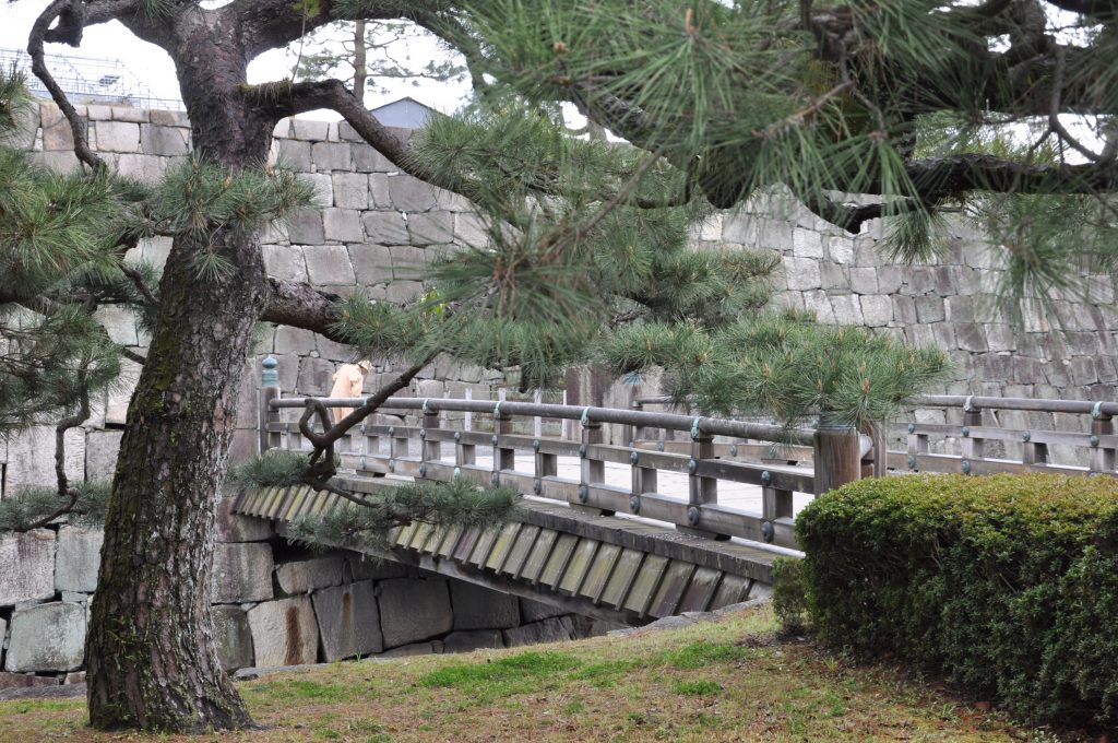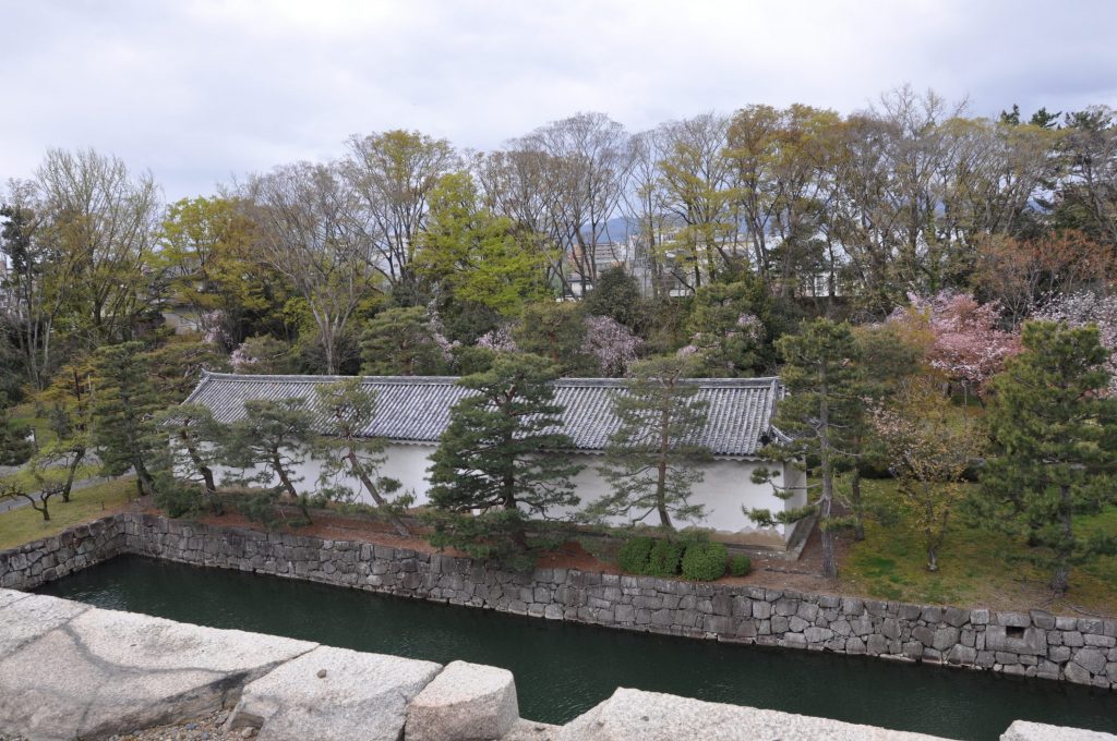 Je commence par visiter les jardins situés entre les deux enceintes. Le temps est menaçant et je ne réussis pas à éviter toutes les gouttes. Je suis presque seul car tous les groupes de touristes déjà sur les lieux se précipitent vers le palais ninomaru. Longue flânerie dans ce très beau jardin avec cerisiers en fleurs dont certains sont des cerisiers pleureurs. La douve intérieure est très belle avec ses deux ponts qui permettent d’accéder au palais onmaru. Lles 2 bâtiments de réserve de riz sont situés à l’ouest.