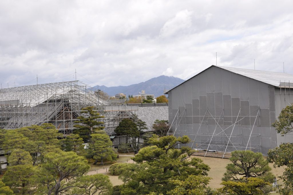 La visite du palais honmaru se résume au jardin et à grimper les hautes marches qui mènent au socle du dojon détruit car, comme je l’ai déjà dit, le palais honmaru lui-même est en complète rénovation.