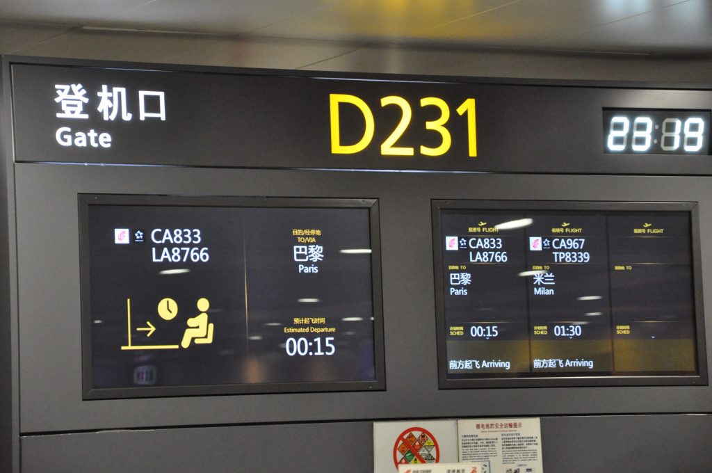 Et là c’est un peu le far-west. Une fois trouvé le comptoir pour les transferts internationaux, on nous dit qu’il nous faut attendre pour obtenir un autre ticket d’embarquement (celui que j’ai ayant pourtant été délivré par Air China). Après quelques instants, une « gilet jaune » arrive avec un tas de cartes et, un passager après l’autre, elle échange nos boarding pass avec les mêmes (délivrés par Air China également) mais avec un bandeau bleu en haut et quelques mots écrits en chinois. Jusqu’ici tout va bien. Mais ensuite, on doit passer l’immigration pour entrer en Chine, puis rentrer à nouveau en passant les contrôles de sécurité et de nouveau l’immigration qui tamponne notre visa et le ticket d’embarquement. C’est peut-être moi qui me suis trompé de chemin : en tout cas j’ai bien visité l’aéreoport. Et je ne peux pas dire que le personnel chinois ait été très accueillant ni coopératif pour m’informer (tout le contraire des japonais).